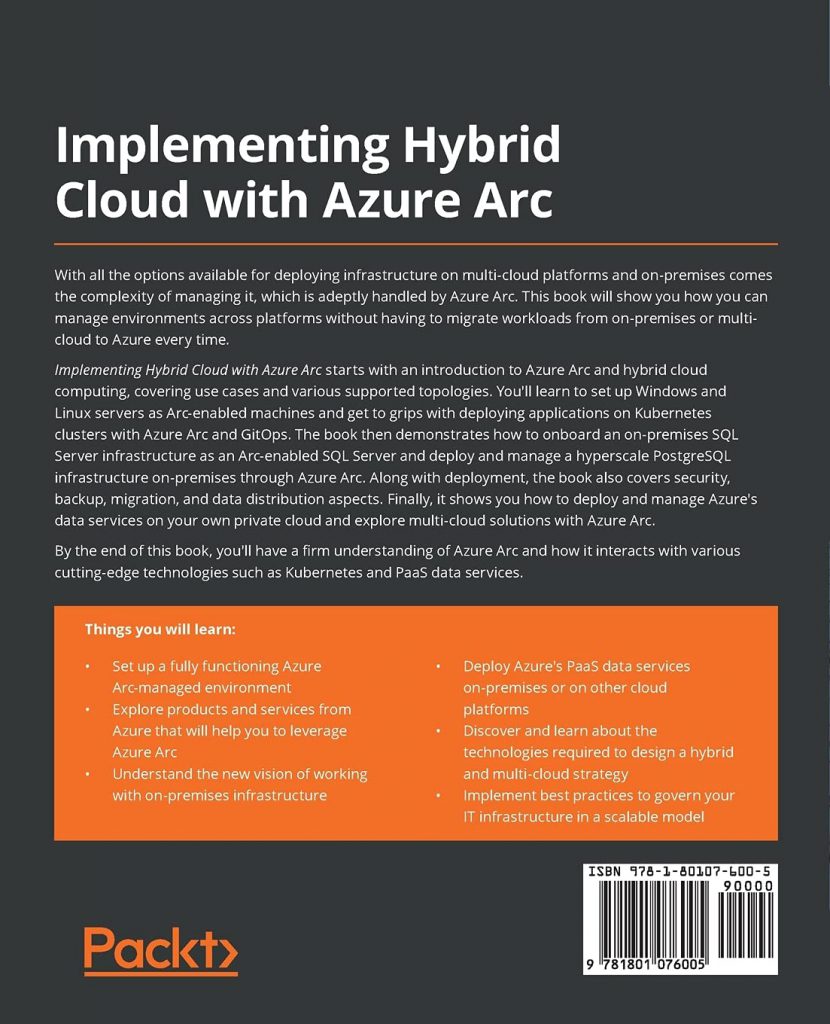 Implementing Hybrid Cloud with Azure Arc starts with an introduction to Azure Arc and hybrid cloud computing, covering use cases and various supported topologies. You’ll learn to set up Windows and Linux servers as Arc-enabled machines and get to grips with deploying applications on Kubernetes clusters with Azure Arc and GitOps. The book then demonstrates how to onboard an on-premises SQL Server infrastructure as an Arc-enabled SQL Server and deploy and manage a hyperscale PostgreSQL infrastructure on-premises through Azure Arc. Along with deployment, the book also covers security, backup, migration, and data distribution aspects. Finally, it shows you how to deploy and manage Azure’s data services on your own private cloud and explore multi-cloud solutions with Azure Arc.